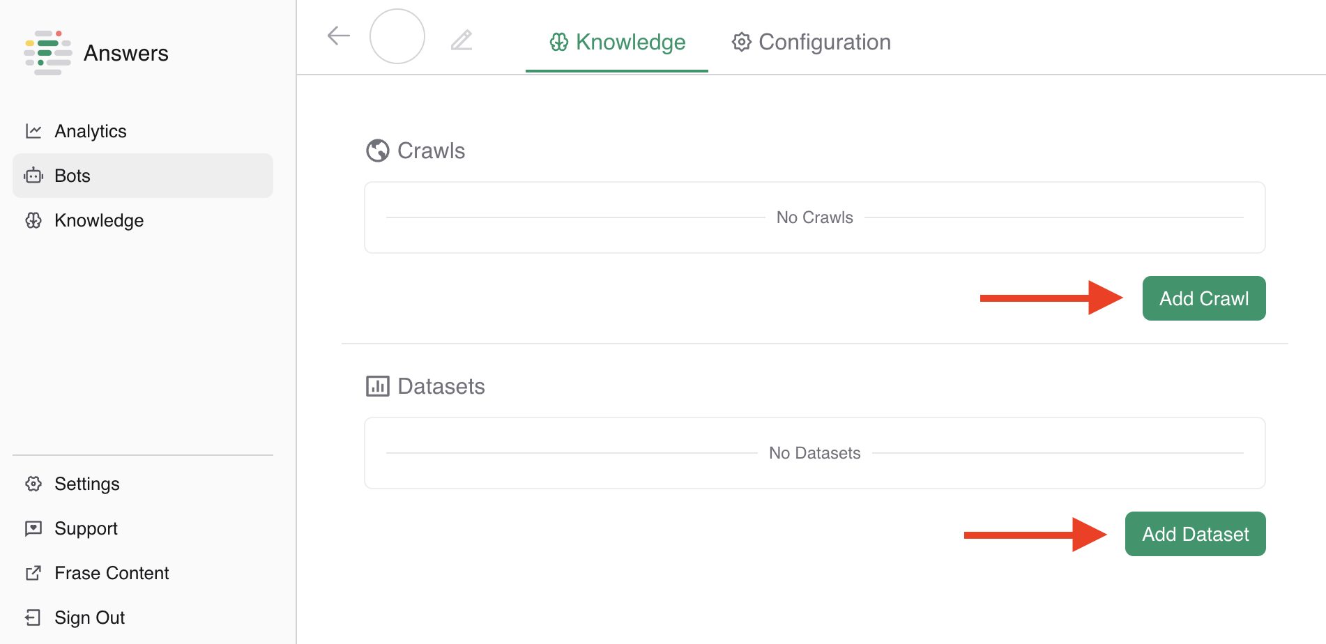 Option 2: Go to the Knowledge tab in the left sidebar to create your Crawls and Datasets. Then return to your bot and link them in its Knowledge tab