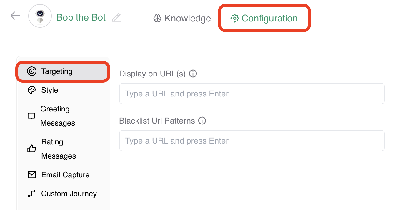 - Under the Targeting section, remove the URL where the chatbot is currently set to appear