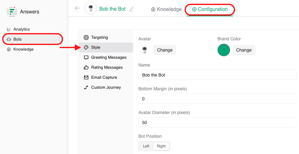 - Bot Positioning: Choose whether the chatbot appears on the left or right-hand side of the page.