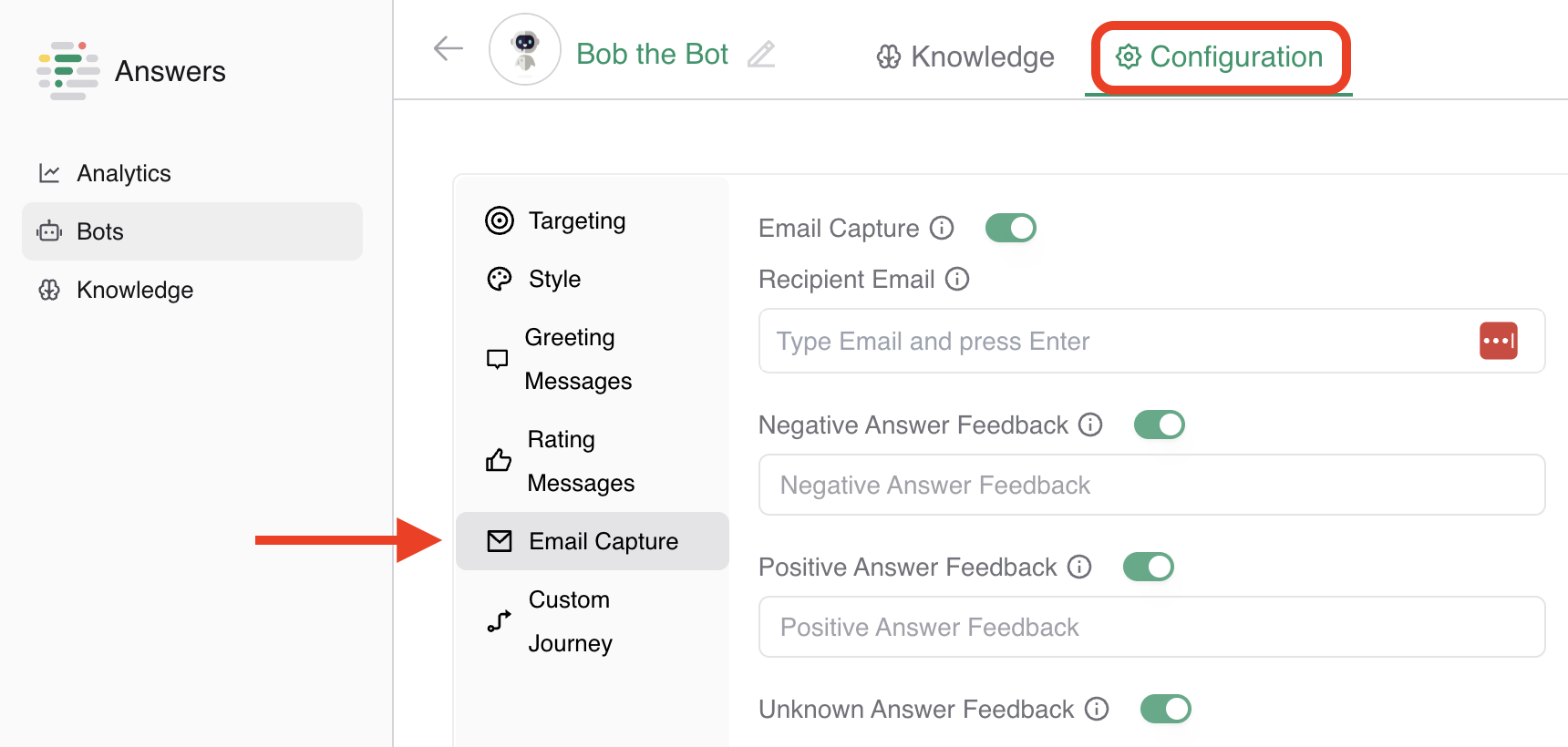 - Unknown Answer Feedback: Choose whether to show the email prompt when the chatbot doesn't understand the user