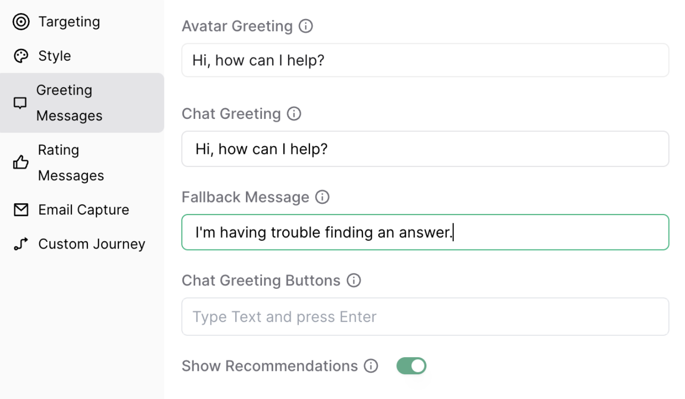 - Avatar Greeting: The message shown before the user opens the chatbot.
