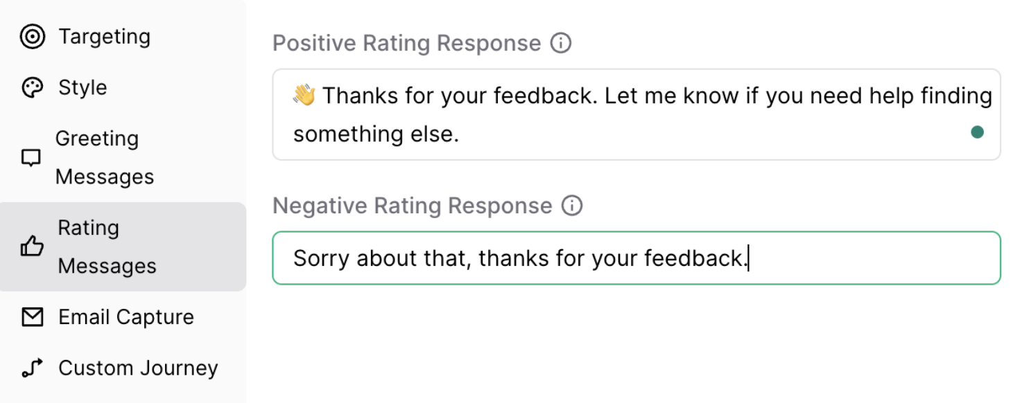 - Thumbs Down Message: Message shown when a user gives a negative rating