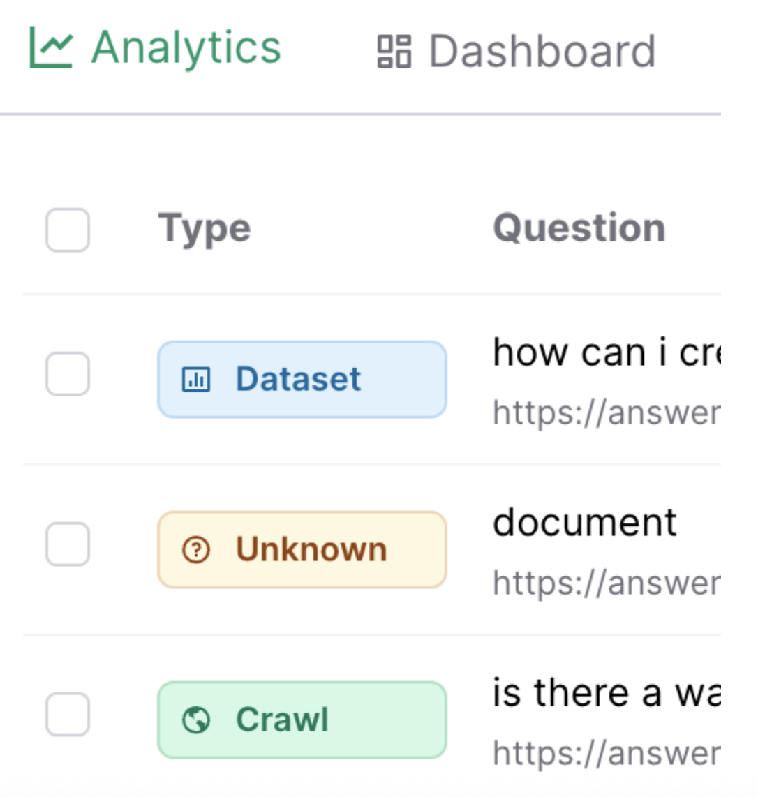 📖 Dataset and Crawl answers appear here when users provide negative feedback, prompting you to review them. Unknown answers always appear here.